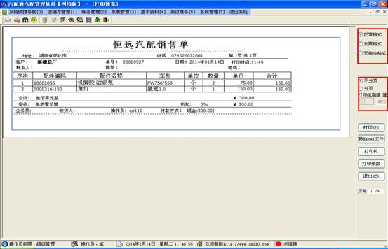 點(diǎn)擊銷售打印按鈕,將彈出銷售打印預(yù)覽窗口,如下圖,右邊第一個(gè)紅框可選擇打印格式。第二個(gè)紅框,當(dāng)選擇不分頁(yè)時(shí)軟件會(huì)自動(dòng)調(diào)整打印高度,當(dāng)選擇分頁(yè)時(shí)軟件會(huì)根據(jù)下方打印高度框設(shè)置的值調(diào)整高度。
