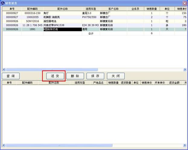 先使用查詢功能找到您要退貨的單子,如果您不記得單號(hào)可以根據(jù)時(shí)間范圍來(lái)查詢。查詢出某時(shí)間段的銷售后,選擇您要退貨的配件,點(diǎn)擊“退貨”按鈕,如下圖。