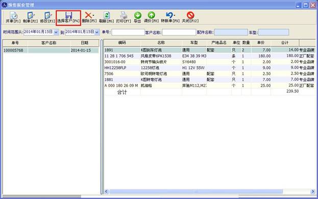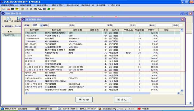 點(diǎn)擊“開單”按鈕,左邊的表格將會(huì)自動(dòng)生成單號(hào),并彈出配件選擇窗口,如下圖(2.4.2)