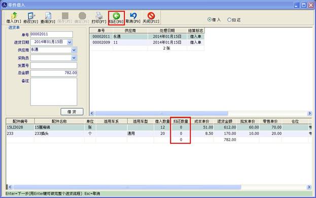 選擇一個(gè)單子后,點(diǎn)擊“歸還”按鈕,可對(duì)此單子上的配件做歸還操作,其操作過(guò)程和退貨給供應(yīng)商類似,點(diǎn)“歸還”后,下方的表格將多一“歸還數(shù)量”這么一列,在此列中輸入數(shù)量,再點(diǎn)上面的“保存【F5】”按鈕即可。