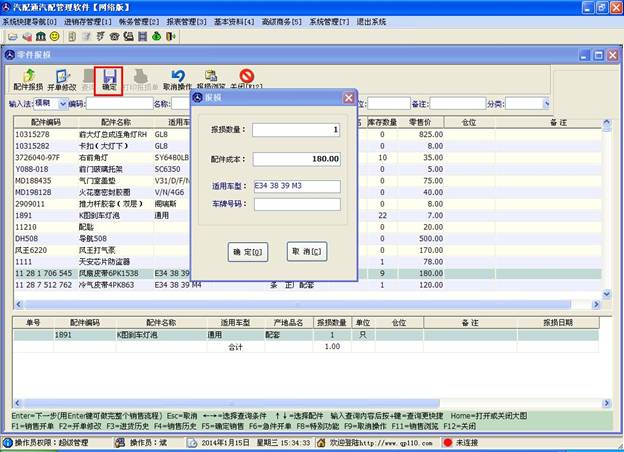 打開配件報(bào)損窗口,找到要報(bào)損的配件,雙擊,輸入報(bào)損數(shù)量點(diǎn)確定,最后再點(diǎn)擊下圖標(biāo)記出來(lái)的“確定”按鈕,在彈出來(lái)的報(bào)損編輯窗口中輸入相關(guān)信息。