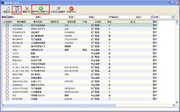 當(dāng)您打開配件網(wǎng)上銷售窗口時(shí) 如下圖,下方的表格會(huì)自動(dòng)幫您讀出您的庫(kù)存數(shù)據(jù),您可以點(diǎn)“全選”按鈕選擇所有配件,也可以在下面的表格中勾選您要上傳的配件,選定后點(diǎn)擊“配件網(wǎng)上銷售【F4】”按鈕即可。注意點(diǎn)擊配件網(wǎng)銷售按鈕時(shí)要求在連接到qp110的狀態(tài)下才能進(jìn)行。