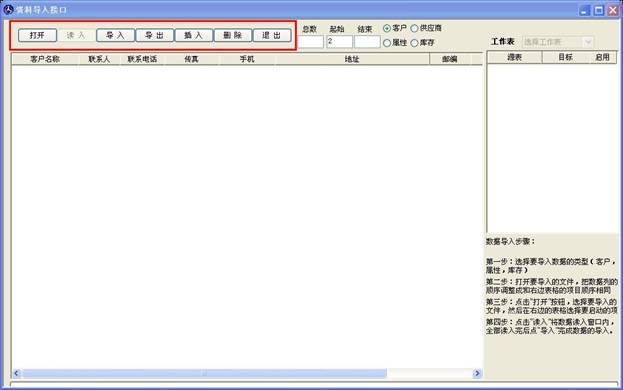 數(shù)據(jù)導(dǎo)入導(dǎo)出可以將您保存在電腦上的excel 文件 導(dǎo)入到軟件里,此窗口支持導(dǎo)入的有客戶資料導(dǎo)入,供應(yīng)商導(dǎo)入,屬性導(dǎo)入和庫(kù)存導(dǎo)入,如下圖。四個(gè)類型的導(dǎo)入操作都一樣,現(xiàn)在我們以屬性導(dǎo)入為例進(jìn)行講解。